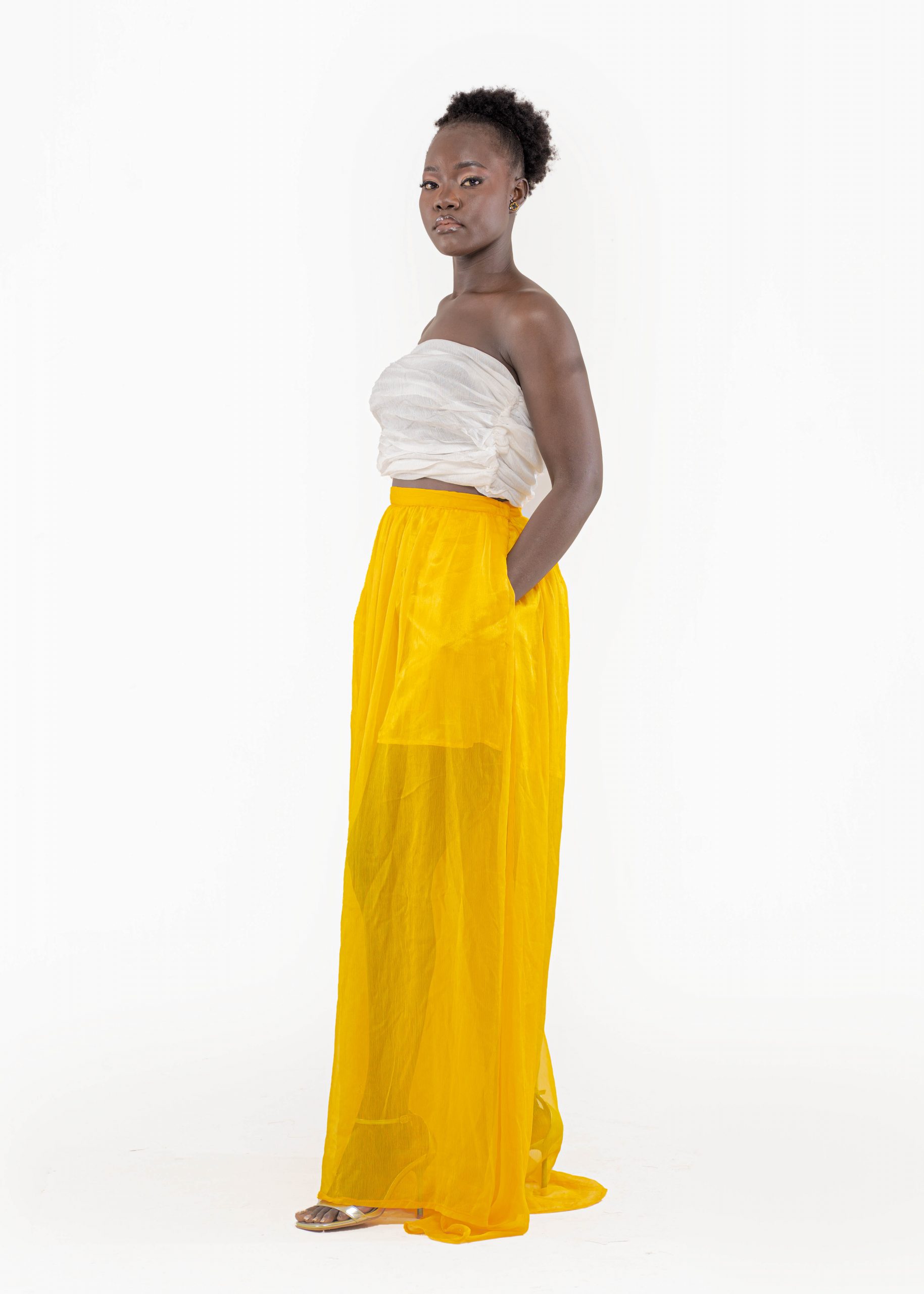 Each outfit is a tribute to an anecdote or a life lesson. The skirt-trousers of the VESPA set (MAYA collection) tells the story of one of the designers of the house (D. Pavolini) and her emancipation from the gender dress diktats she suffered in her native Italy. The DAILES dress highlights the symbol character of the POCHÉ collection: the Entity, which represents the quest for self through a stigmatizing society.