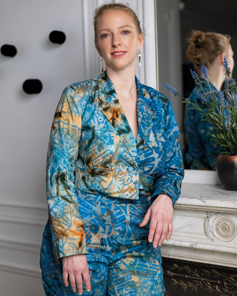 La teinture initiale veut rappeler une constellation : sur un tissu blanc, des gouttes de cire sont diffusées en utilisant un balais. C’est le début de la vie de ce tissu. Trois techniques sont nécessaires pour arriver à ce résultat : la pluie, le pliage en accordéon rectangle, et le shibori. Il faut donc compter 3 étapes durant chacune plusieurs heures pour obtenir ce tissu.