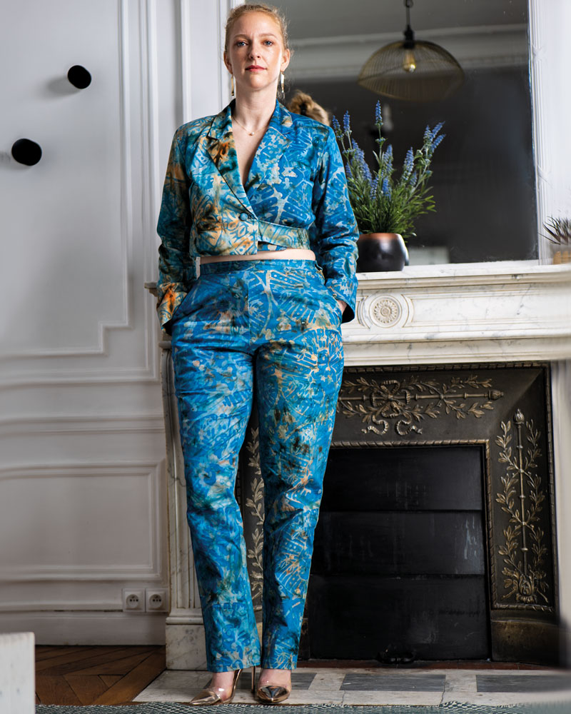 Le bas de la combinaison est donc en pantalon à pieds larges. Les plis font1 cm et le rendu est fluide et très évasé. Le pantalon est doublé.
