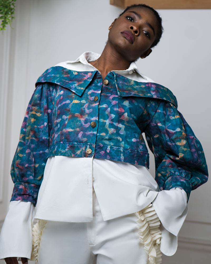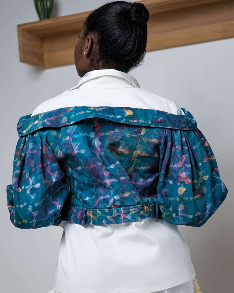 Blouson jeans deux en un teinté au tampon de bois de la collection Kroskel x Paola Audrey. Une chemise à col classique blanche couplée à un blouson jeans décolleté à manches trois quarts pour un effet deux en un.
