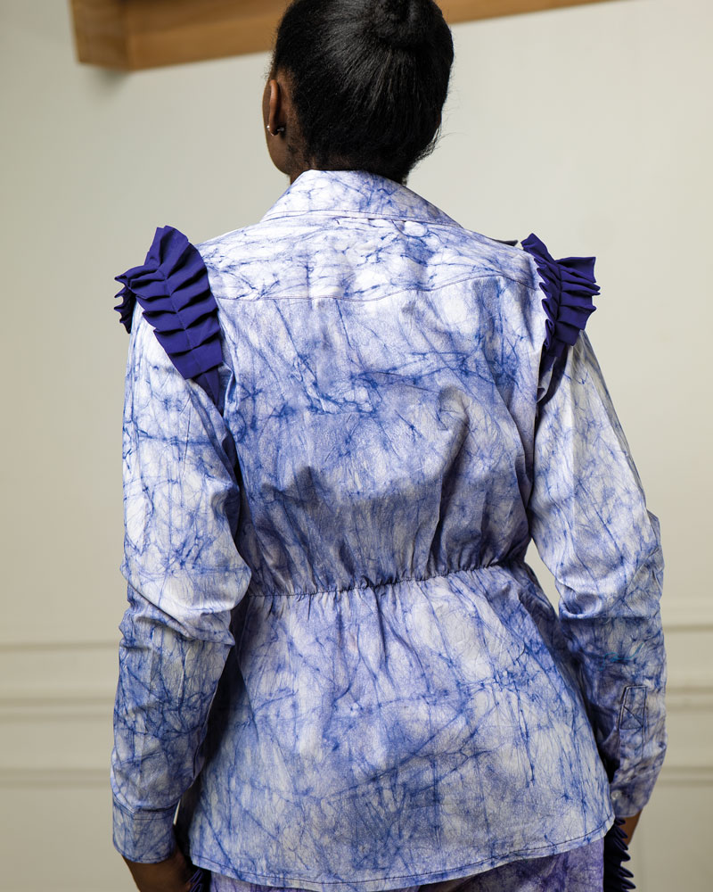 Chemise batik indigo Kroskel x Paola Audrey avec plis en mousseline sur les épaules de chaque côté de la chemise.