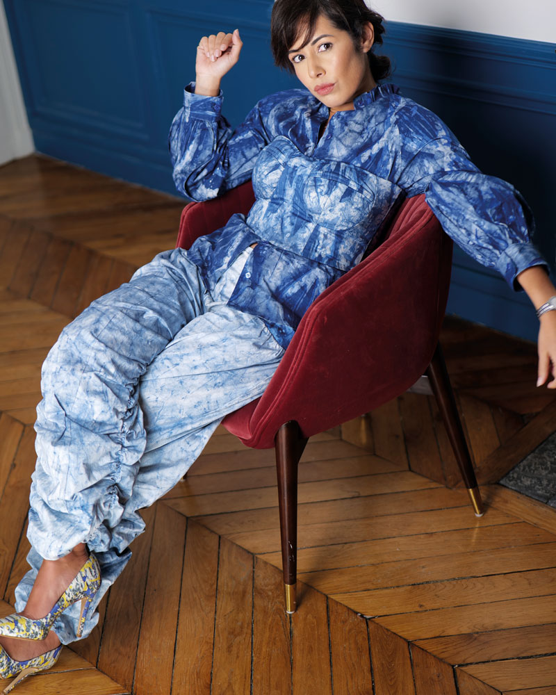 Un pantalon pattes d’éléphant, ou pattes d’eph, c’est un must dans le garde-robe. Ici, il permet d’interpréter le fil conducteur “trapèze” avec un pantalon taille haute fluide qui reste près du corps jusqu’à la taille, pour s’élargir, en forme de trapèze (isoscèle, pour être exacte) jusqu’aux pieds qu’il peut délicatement masquer grâce à sa grande largeur. C’est, sans contexte, une pièce douce aux lignes du corps et soyeuse sur la peau : tout pour plaire. Ici, elle est associée à un crop top chemise sans manches élastique à la taille.