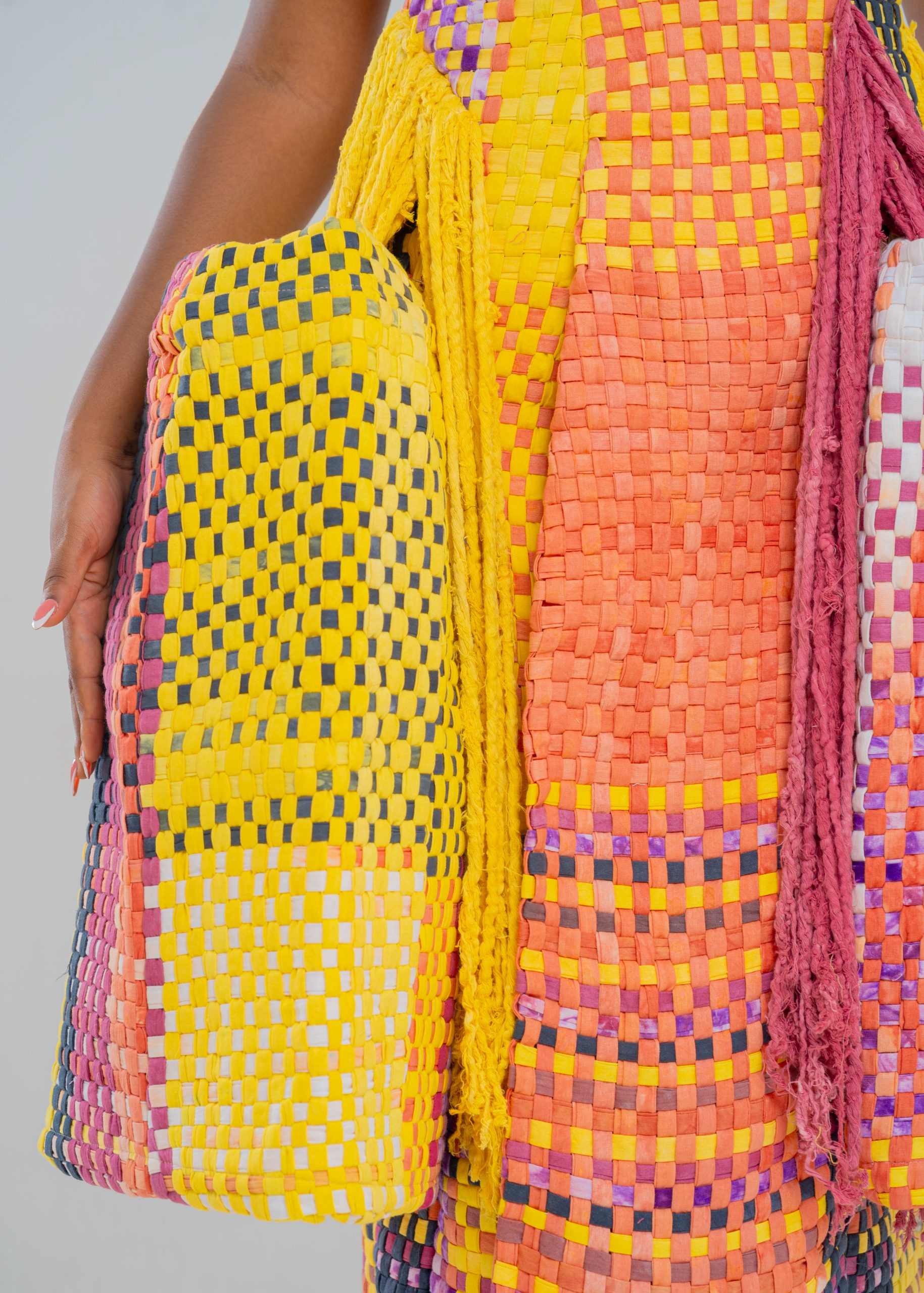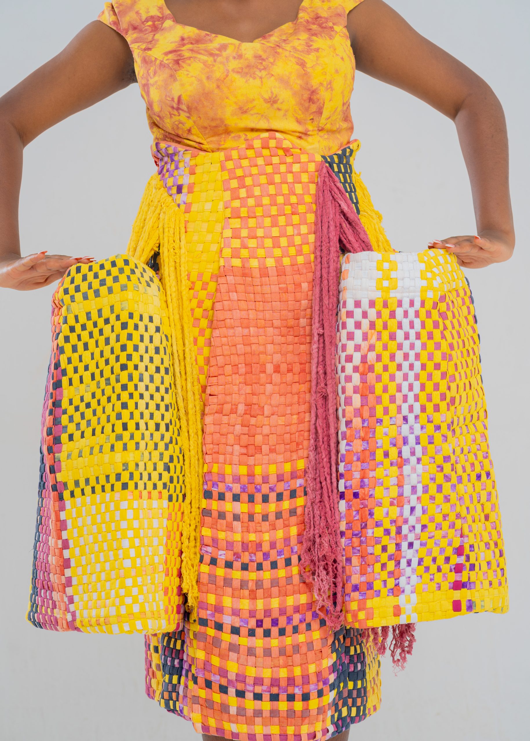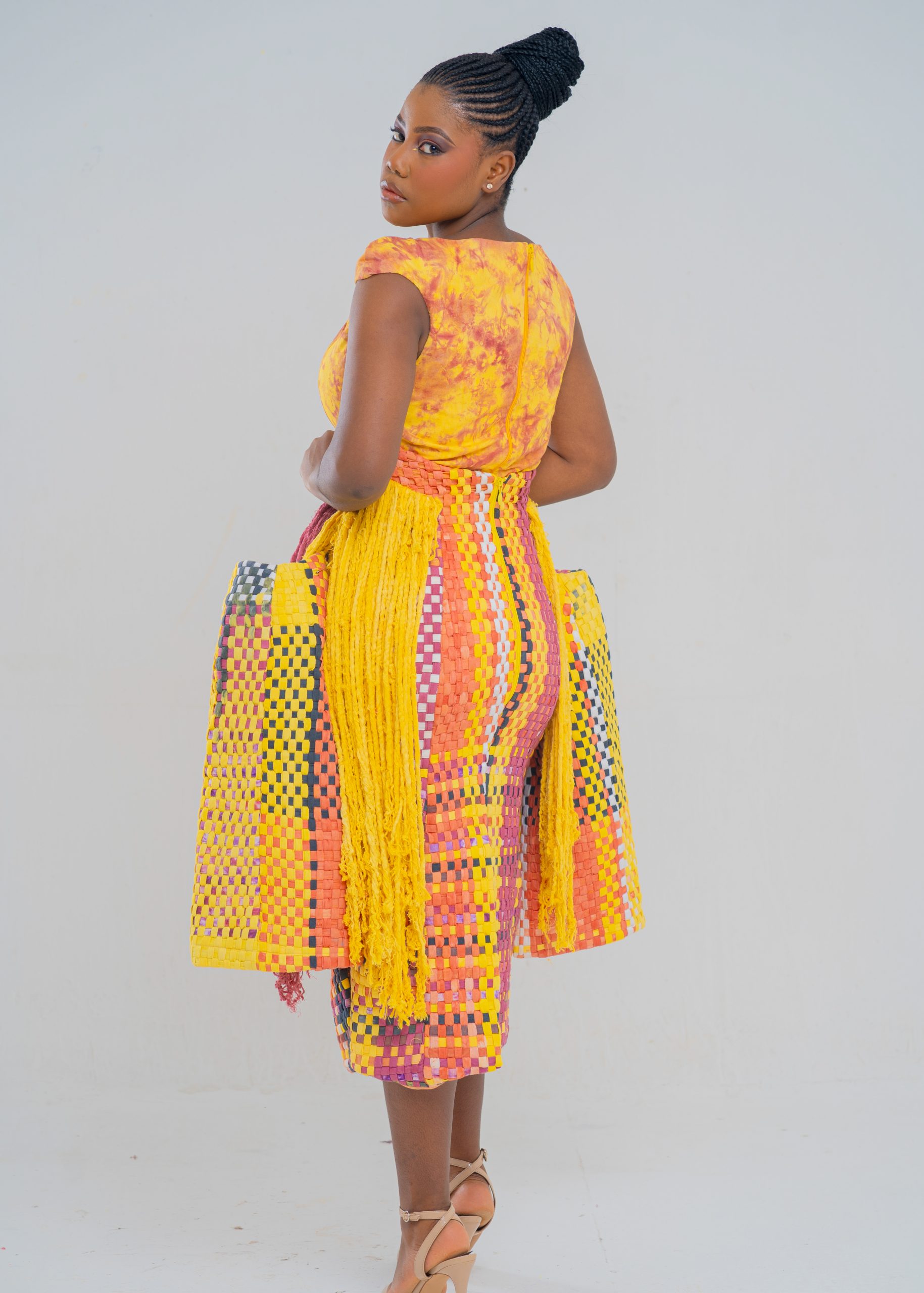 Cette pièce trois-en-un, entre tradition et modernité, symbolise la purification et l’ancrage. Sa jupe montante, ornée de franges évoquant le balai, s’associe à un dessus de robe architectural et un haut structuré aux manches courtes. Des motifs d’hibiscus et un accessoire en forme de tour parachèvent ce chef-d’œuvre.